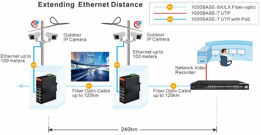 The two mini-GBIC slots built in the Gigabit Industrial Switch support SFP auto-detection and dual speed as it features 100BASE-FX and 1000BASE-SX/LX SFP (Small Form-factor Pluggable) fiber-optic modules, meaning the administrator now can flexibly choose the suitable SFP transceiver according to the transmission distance or the transmission speed required to extend the network efficiently. The distance can be extended from 550 meters to 2 kilometers (multi-mode fiber) and 10/20/30/40/50/60/70/120 kilometers (single-mode fiber or WDM fiber). They are well suited for applications to uplink to backbone switch and monitoring center in long distance.