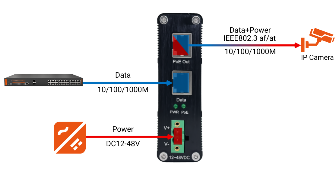 The Industrial PoE Injector delivers 30 watts of 56V DC power over standard Cat.5/5e/6 Ethernet cables, enabling simultaneous data and power transmission to a PoE-powered device (PD) or PoE Splitter. It supports a maximum distance of 100 meters between the injector and the connected device.