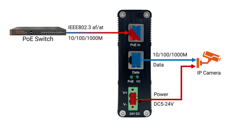 The Fiberroad Industrial PoE Splitter is a high-power solution designed to integrate traditional non-PoE devices into Power over Ethernet networks. It efficiently splits the standard 48-56V DC power from an Ethernet cable, converting it to a stable 12V or 24V DC output. Compliant with the IEEE 802.3at standard, it delivers up to 25 watts of power while maintaining a seamless 10/100/1000Mbps data connection.