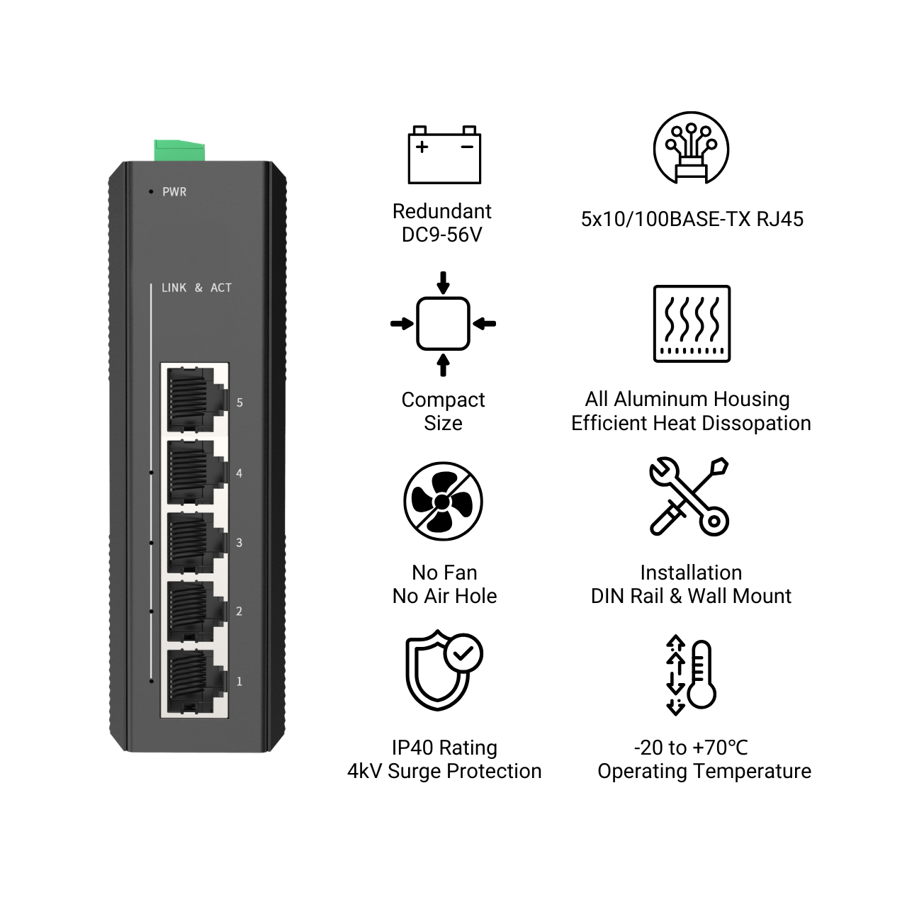 Built to withstand challenging environments, this 5-port Ethernet switch operates seamlessly in temperatures from -20°C to +70°C. Its rugged design ensures reliable performance in industrial automation, outdoor installations, or temperature-fluctuating settings, making it a dependable choice for harsh operational conditions.