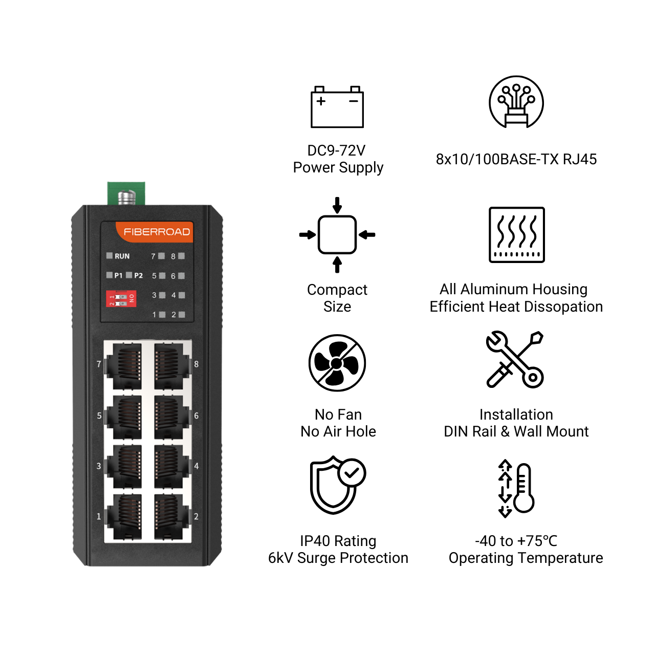 The Fiberroad Auto Pro Series Industrial Ethernet Switch is a state-of-the-art device that has been engineered specifically to cater to the unique needs of industrial automation. It stands out froUpgrading to a 100M Industrial Ethernet Switch such as the Fiberroad FR-7A Series Unmanaged Industrial Ethernet Switch can bring numerous benefits to your network. With its state-of-the-art design and unique features that cater specifically to the needs of industrial automation, this device is an excellent investment for any business looking to improve their networking infrastructure. One of the most significant advantages of upgrading to this switch is its ability to provide faster data transfer speeds, enabling more efficient communication between devices on your network. Additionally, the Auto Pro series ensures reliable connectivity with minimal downtime by offering advanced error detection and correction mechanisms. This switch also comes with robust security features, including access control lists and port security settings that aid in safeguarding against unauthorized access and cyber attacks. Overall, investing in a 100M Industrial Ethernet Switch like the Fiberroad Auto Pro Series offers enhanced performance, reliability, and security for your network, making it a perfect choice for businesses operating in industrial environments requiring high-speed data transmission capabilities.