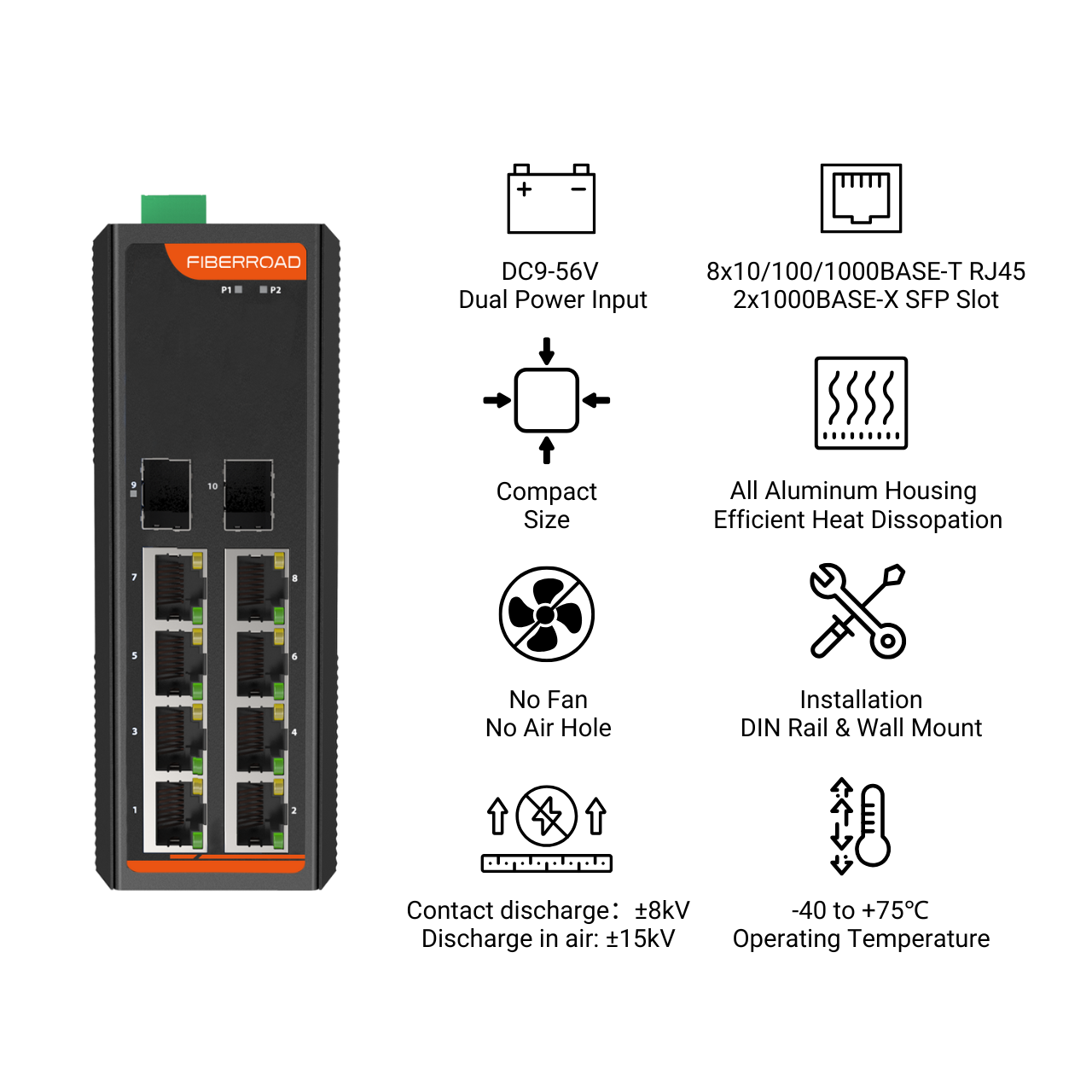 This Industrial 8-Port 10/100/1000T + 2-Port 1000X SFP Ethernet Switch provides robust connectivity and extended network deployment through its fiber-optic link capability, enabling long-distance, high-bandwidth data transmission. Equipped with MAC address auto-learning and auto-aging, it intelligently manages network traffic for optimized performance and security. The combination of 8 Gigabit copper ports and 2 SFP fiber slots ensures flexible integration in industrial environments, supporting both local device connections and fiber-optic backbone links. Ideal for harsh settings like smart factories, rail transit, and power substations, this switch delivers reliable, scalable networking with advanced features for seamless operation in mission-critical applications.