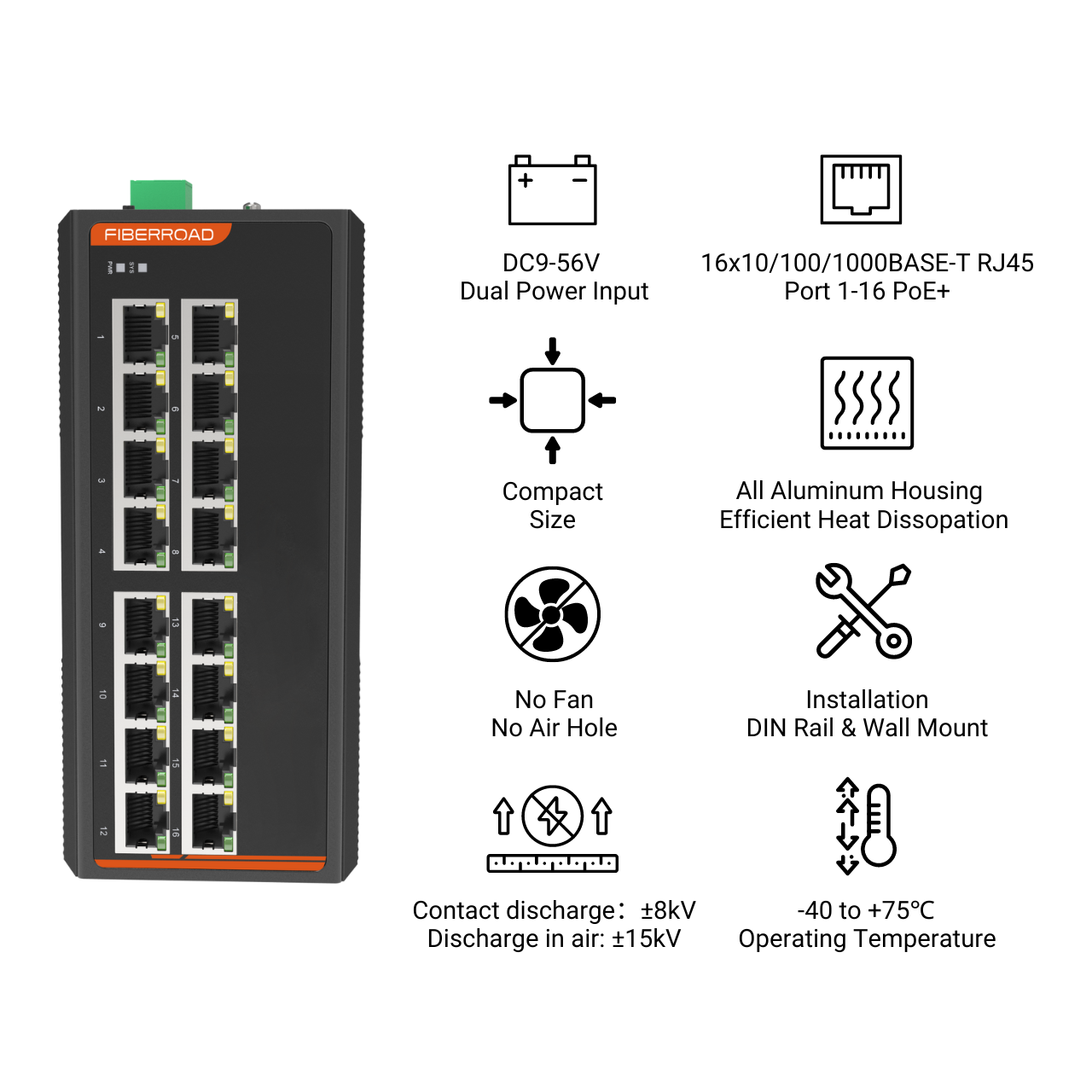 | Copper Ports | 16×10/100/1000BASE-T RJ45 Auto-MDI/MDI-X (Port 1-16) | ||