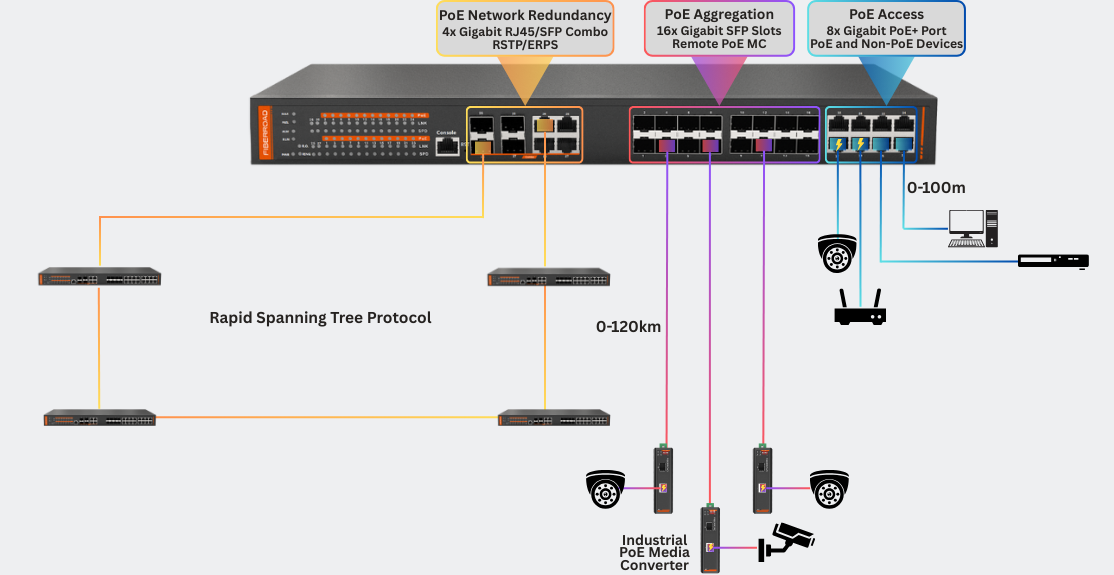 Managed Gigabit PoE Switch designed for both PoE access and aggregation, this high-performance switch features 8× Gigabit PoE+ ports (30W per port) to efficiently power IP cameras, wireless APs, VoIP phones, and other edge devices. For scalable connectivity, 16× Gigabit SFP fiber ports support long-distance, high-bandwidth uplinks, while 4× RJ45/SFP combo ports ensure flexible redundancy and failover protection—maintaining uninterrupted network stability.