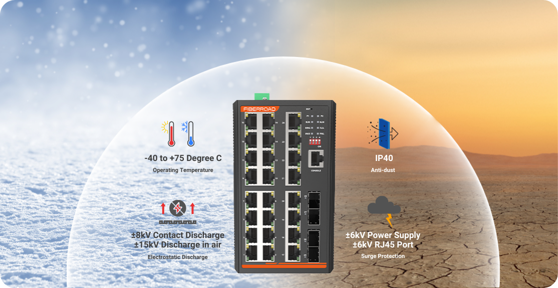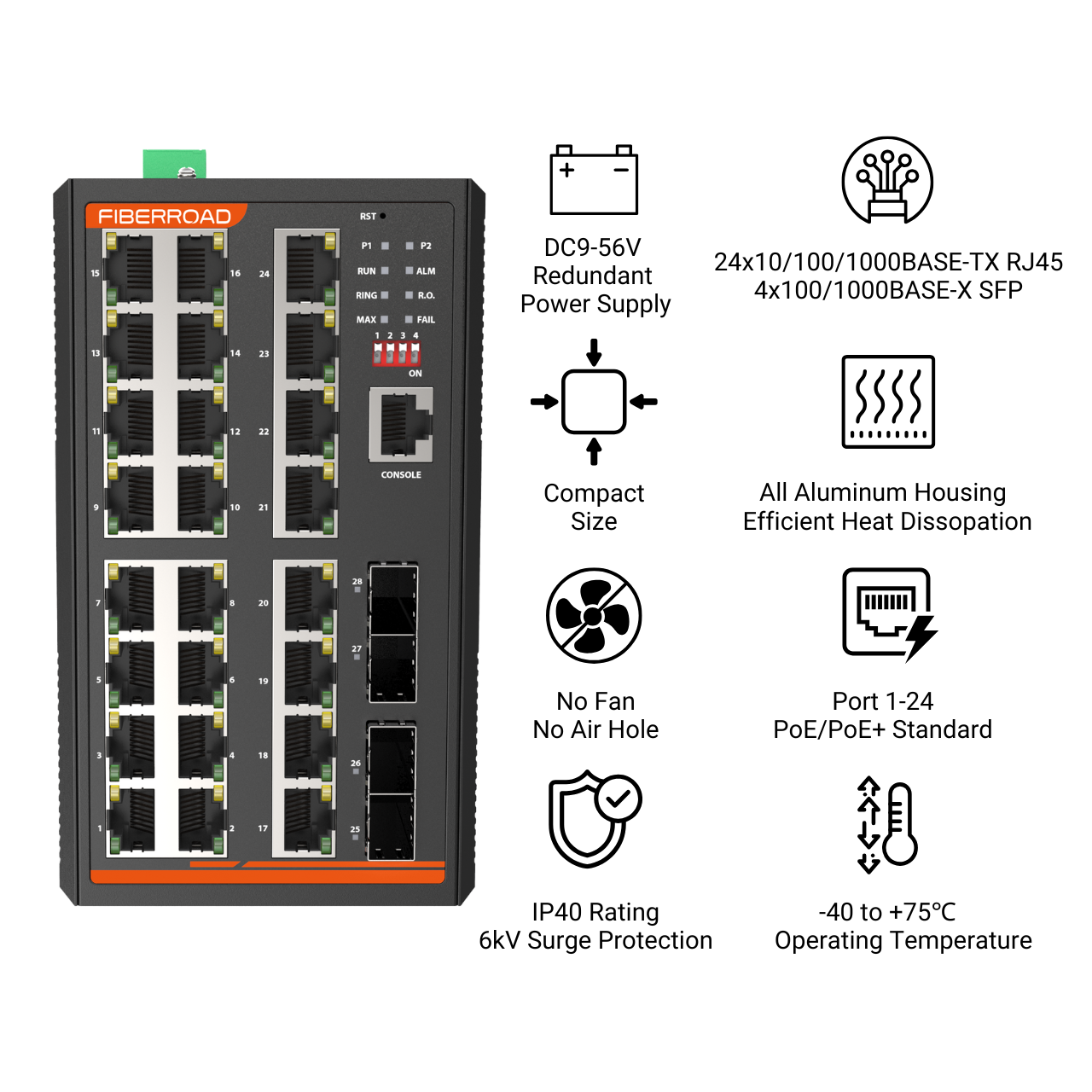 Fiberroad FR-7M3424P is a 24-port managed Industrial PoE Switch designed for the industrial Are you tired of dealing with unreliable network switches that can’t handle the demands of your organization? Look no further than the 24 Port Managed Rugged PoE Switch! This powerhouse device is equipped to handle even the most demanding networking environments. With its robust design and advanced management capabilities, this switch provides unparalleled stability and performance. Its 24 ports offer plenty of connectivity options for all your devices while also delivering power over Ethernet (PoE) to compatible devices, reducing clutter and streamlining your setup. And thanks to its rugged construction, it’s built tough enough to withstand harsh conditions – whether it’s in a factory environment or out in the field. Don’t settle for anything less than optimal performance when it comes to your network infrastructure – upgrade to the 24 Port Managed Rugged PoE Switch today!