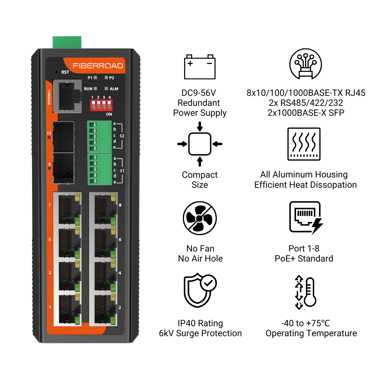 Fiberroad Serial over Ethernet Industrial Switch provides an all-in-one solution. It converts RS232/422/485 connections to Ethernet connections, allowing seamless communication between traditional serial-based devices such as PLC, meters, sensors, and barcode readers to an IP-based Ethernet device. More importantly, the industrial switch is fully compliant with Modbus/TCP and offers a convenient solution for connecting existing devices or controllers running the Modbus serial protocol(Modbus/ACSCII or Modbus/RTU) to an Ethernet network.