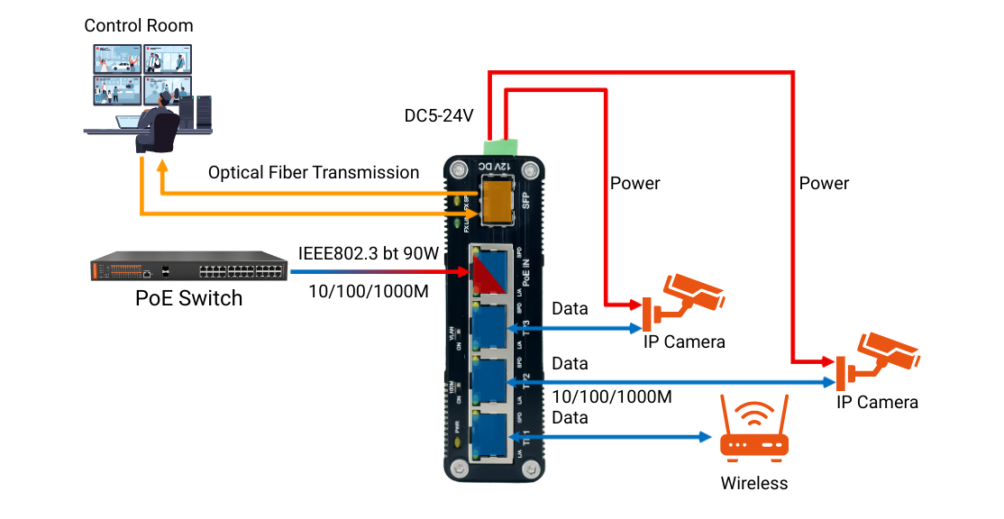 The Fiberroad Industrial PoE Switch delivers high-power connectivity tailored for modern surveillance systems. Supporting the IEEE 802.3bt 90W Power Input, making it ideal for power-hungry devices such as PTZ cameras and advanced access points. The switch features three 10/100/1000M RJ45 ports with dual DC 5-24V power outputs for flexible device integration, along with one 1000M SFP port for long-distance fiber optic transmission to the surveillance control room. Built for industrial environments, it ensures reliable, continuous operation while simplifying cabling and reducing installation costs.