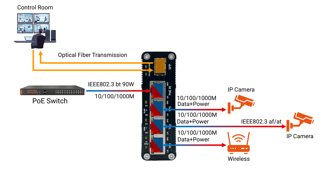 The Fiberroad Industrial PoE Switch is engineered for robust and flexible surveillance deployments. It features three 10/100/1000M RJ45 ports that support IEEE 802.3af/at standards, providing seamless power and data connectivity to IP cameras and other compatible devices. For demanding high-power equipment, the switch also supports the IEEE 802.3bt standard, delivering up to 90W of power input. A key addition is the 1000M SFP slot, which enables long-distance fiber optic transmission back to the surveillance control room, ensuring reliable data integrity over extended distances. This combination of versatile power options and extended connectivity makes it an ideal, all-in-one solution for industrial-grade security systems.