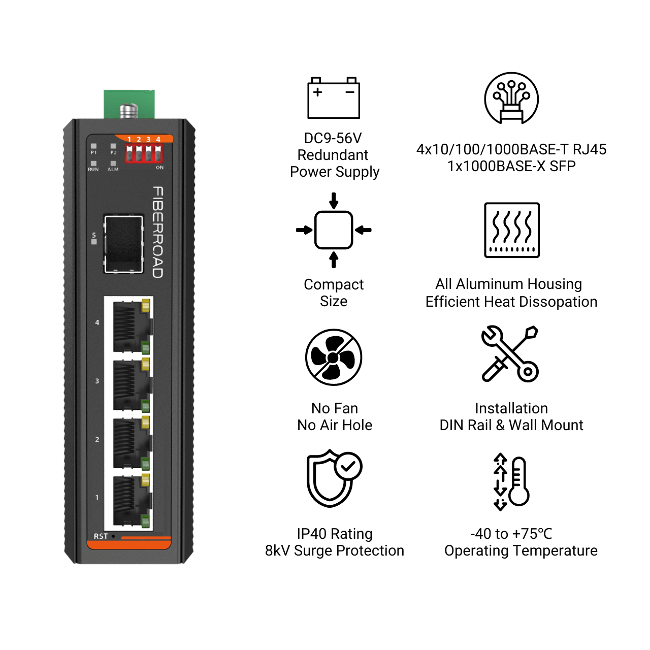 | Ports | 4×10/100/1000Base-T RJ45 ports, 1x1000Base-X SFP/1×9 |