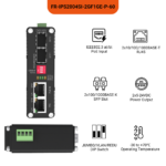 The FR-IPS2004S Series Industrial Switch is a versatile and robust networking solution designed for demanding access applications. It features two 10/100/1000BASE-T RJ45 ports that uniquely support both IEEE 802.3 at/bt (PoE++) power input and IEEE 802.3 af/at (PoE+) output, allowing the switch to be powered by a compatible upstream device while simultaneously delivering both data and power to connected IP cameras or other equipment. This flexibility is complemented by two 1000BASE-X SFP ports, which enable the creation of high-speed fiber optic uplinks and support critical optical link redundancy to ensure maximum network uptime and reliability in mission-critical industrial environments.