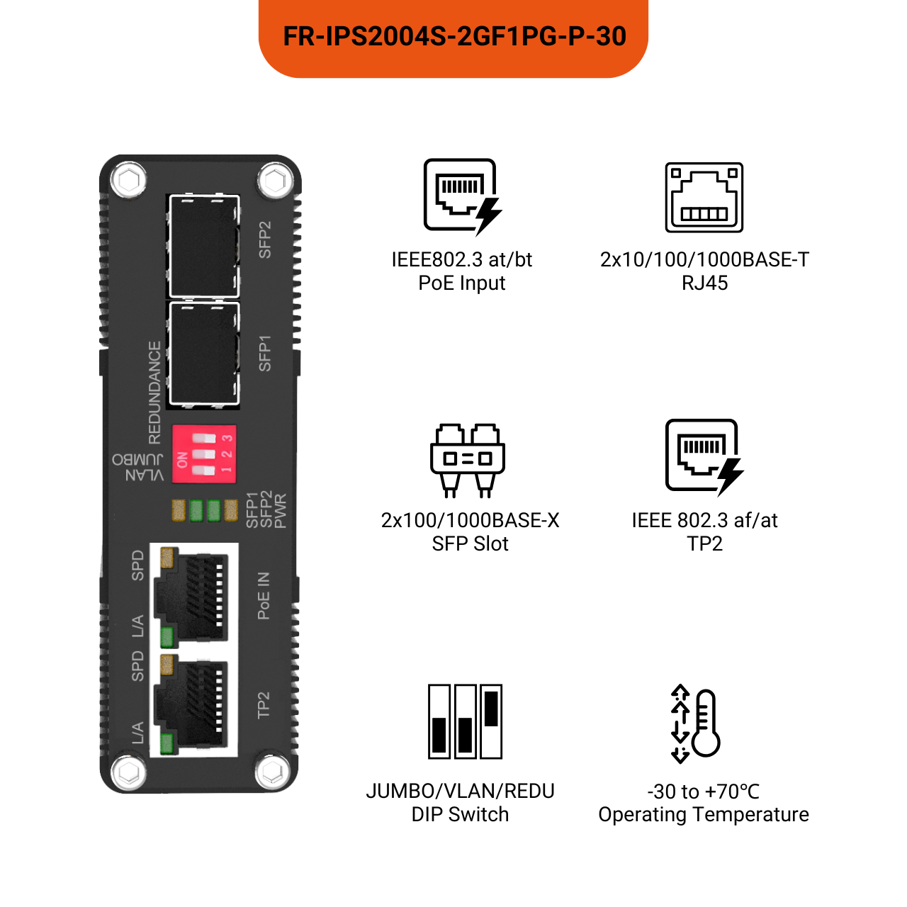 The FR-IPS2004S Series Industrial Switch delivers exceptional flexibility and robust network management for demanding access applications. It features two 10/100/1000BASE-T RJ45 ports: one (TP1) can accept IEEE 802.3at/bt (PoE+/PoE++) power input, while the other (TP2) provides a 10/100/1000BASE-T data connection along with a DC 5-24V output, enabling it to power and connect a wide range of devices like IP cameras directly. For critical network segmentation, the switch integrates a user-friendly DIP switch for effortless VLAN configuration. A pre-defined setting logically isolates the network by grouping TP1 and SFP1 into VLAN1 and TP2 and SFP2 into VLAN2, enhancing security and traffic management without the need for complex software. This combination of versatile power delivery, fiber optic capability, and simplified VLAN management makes it an all-in-one solution for secure and resilient industrial networks.