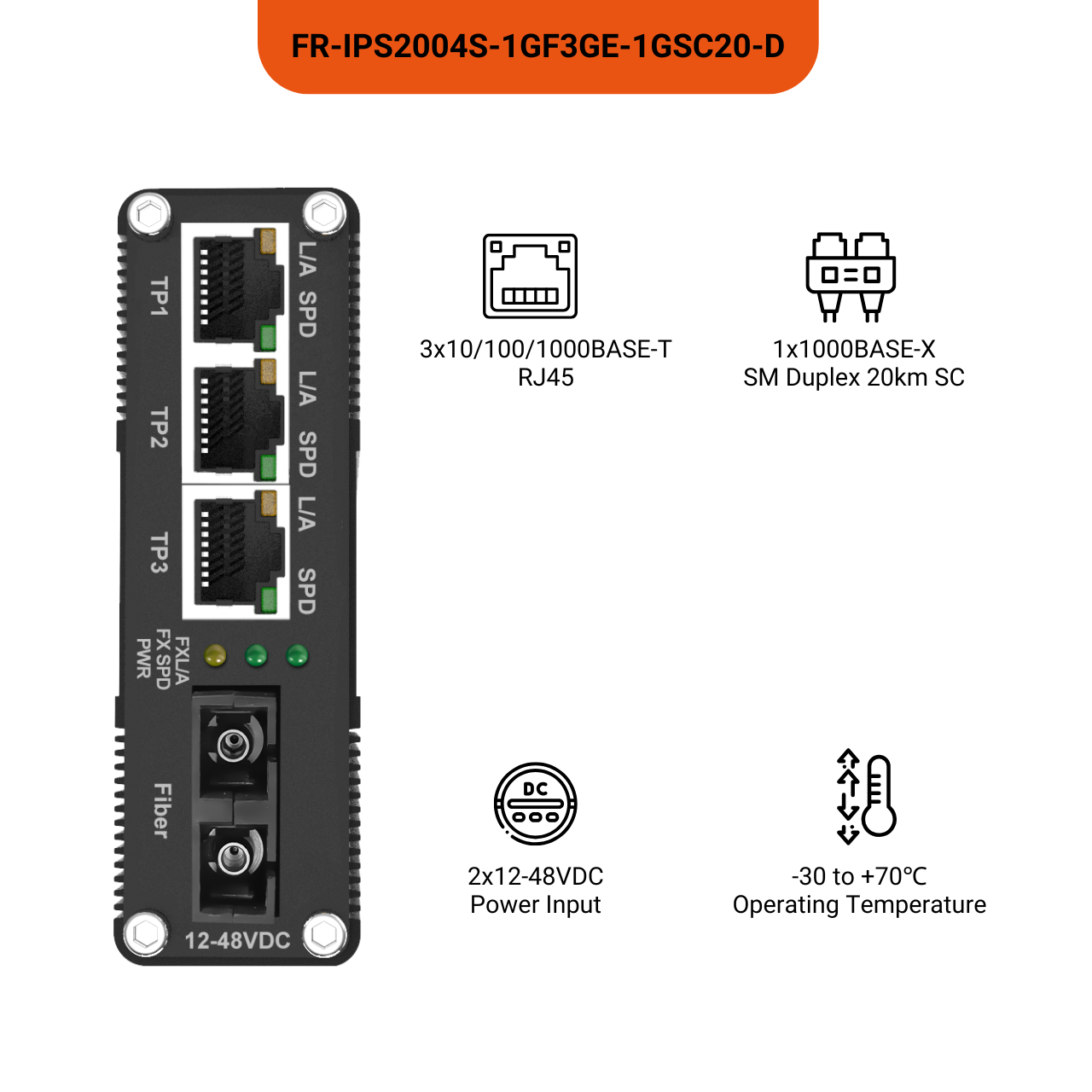 Industrial-Grade 4-Port Switch: 3x 10/100/1000T RJ45 & 1x Gigabit 20km SC Fiber