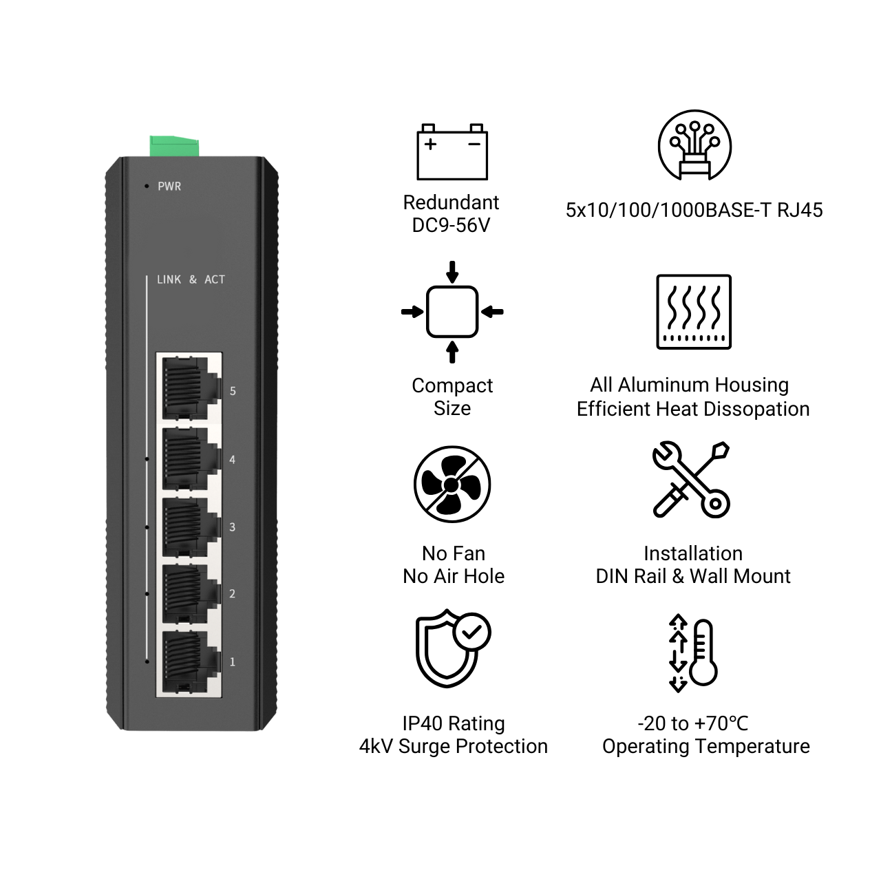 Engineered for extreme environments, this 5-port Gigabit Ethernet switch operates flawlessly in temperatures ranging from -20°C to +70°C. Its industrial-grade construction ensures reliable connectivity in harsh settings such as manufacturing floors, outdoor surveillance systems, or energy facilities, where consistent performance under thermal stress is critical.